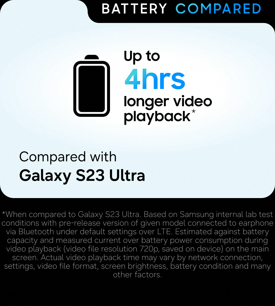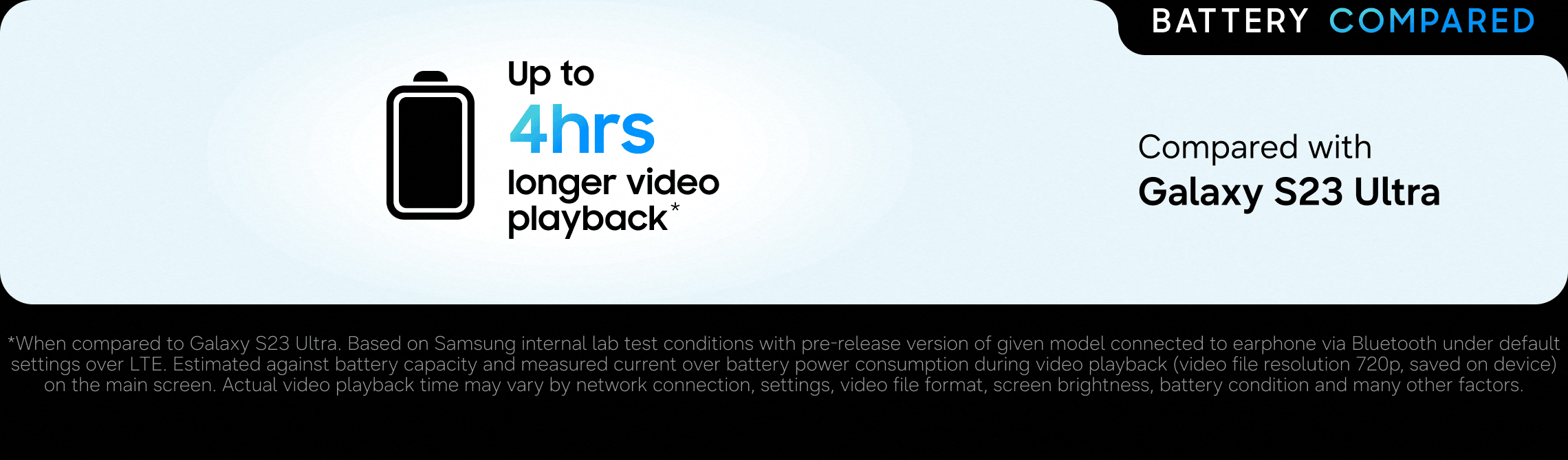 Actual battery life varies by network environment, features and apps used, frequency of calls and messages, the number of times charged, and many other factors. Estimated against the average usage profile compiled by UX Connect Research. Independently assessed by UX Connect Research between 2026.1.8-2026.1.30 in US and UK with pre-release versions of SM-S942, SM-S947 and SM-S948 under default setting using LTE and 5G Sub6 networks. NOT tested under 5G mmWave network.
